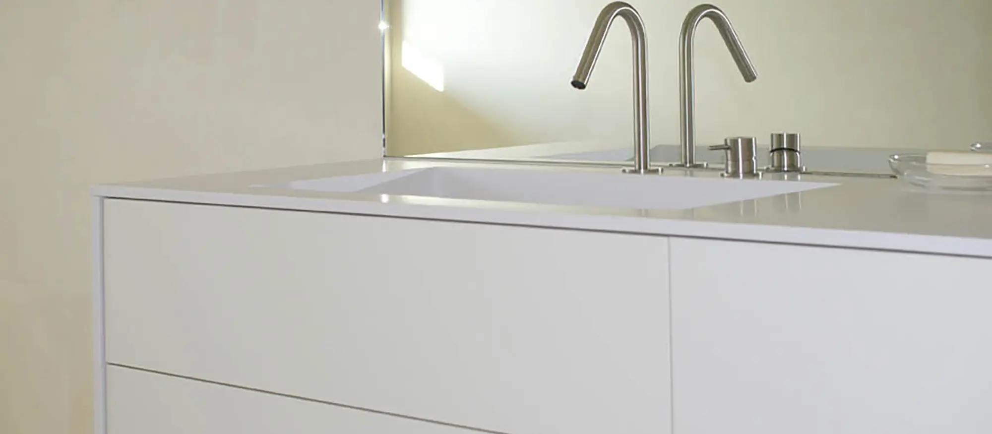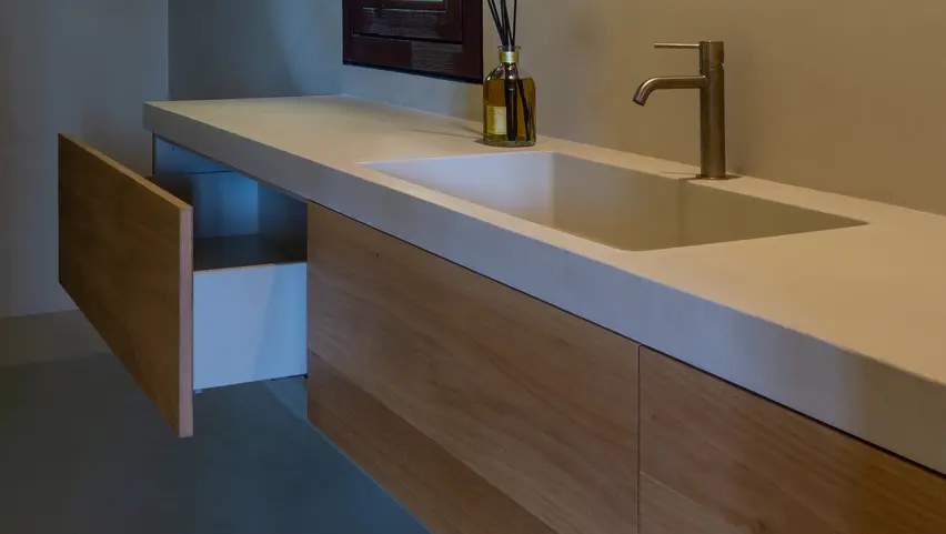 - Waschtische mit integrierten Stauraumkonzepten, bei denen alles seinen Platz findet.