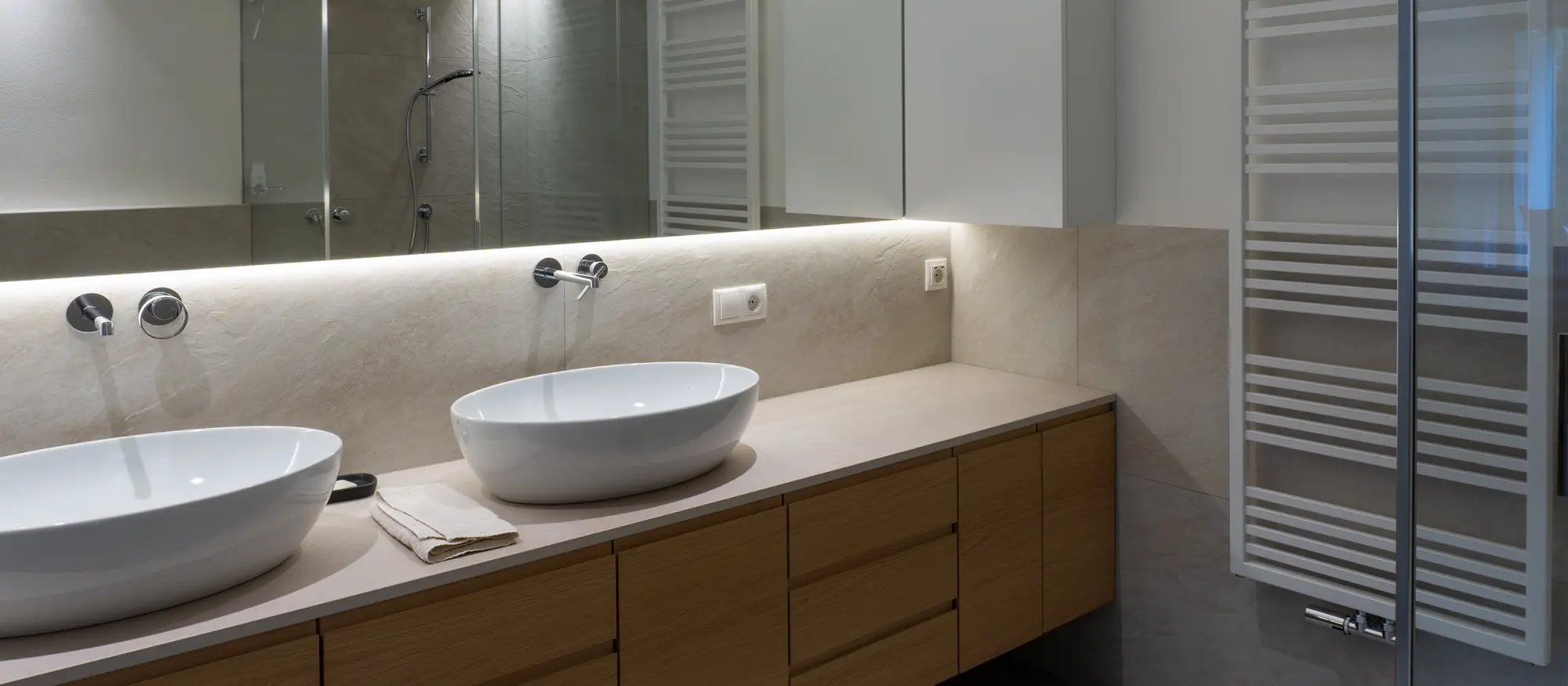 Ob massgefertigte Waschtische, hochwertige Verkleidungen, Möbel mit viel Stauraum oder individuell angepasste Nischenlösungen: Wir verbinden präzises Handwerk mit Materialien, die deinem Bad Charakter und Tiefe geben.